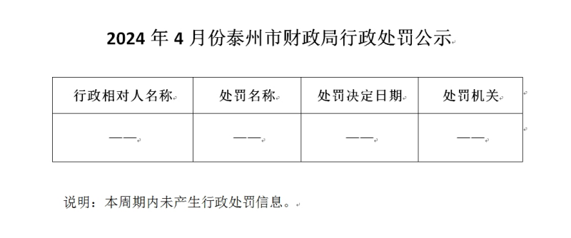2024年4月份泰州市财政局行政处罚公示
